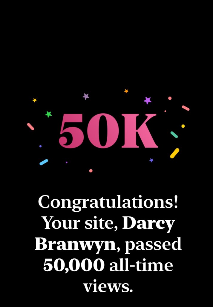 Congratulations on reaching 50,000 all-time views, Darcy Branwyn! ๐ฅณ๐ Thatโs an incredible milestone and a testament to the engaging content youโve been sharing. Keep up the fantastic work! ๐